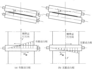 若輥子是帶驅(qū)動的,給不銹鋼帶的作用力是向前的動力,則不銹鋼帶所受到的向前的動力的合力偏向不銹鋼帶被夾緊的一端,會產(chǎn)生一個使不銹鋼帶向這一方向偏移的力偶M偏,所以不銹鋼帶是向著壓力大、輥子開口小的一端偏移。若輥子是從動的,給不銹鋼帶的作用力是向后的阻力,則會使不銹鋼帶向壓力小、輥子開口大的一端偏移。